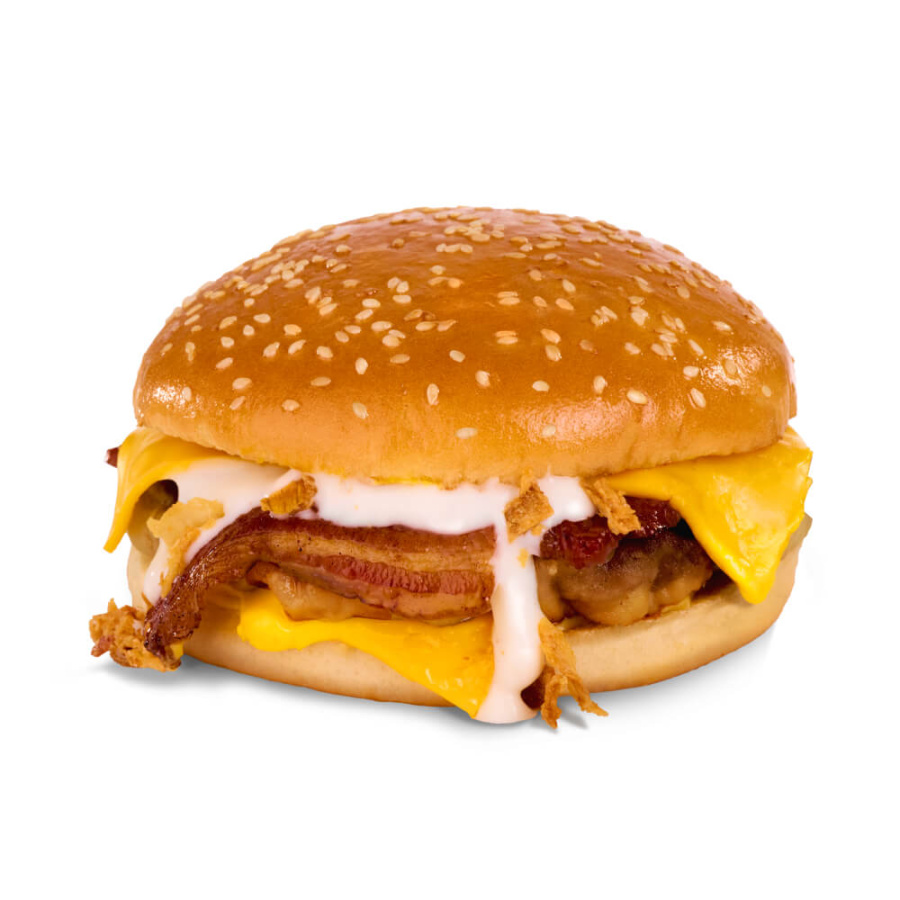 Большая булочка с кунжутом Котлета мясная Бекон Сыр Хохланд Лук фри Соус альфредо